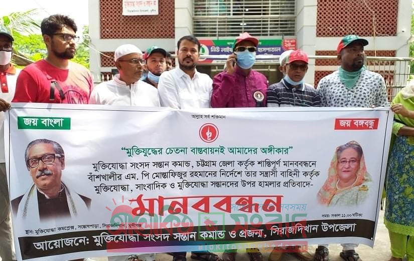 বাঁশখালীর এমপি মোস্তাফিজুর রহমানের পদত্যাগ ও বিচার দাবীতে মুন্সীগঞ্জের সিরাজদিখানে মুক্তিযোদ্ধা সংসদ সন্তান কমান্ড ও প্রজন্ম’র আয়োজনে মানববন্ধন অনুষ্ঠিত হয়েছে। গতকাল শনিবার বেলা ১১ টায় উপজেলা মুক্তিযোদ্ধা কমপ্লেক্সের সামনের রাস্তায় এই মানববন্ধন হয়।