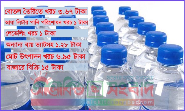 ট্যারিফ কমিশনের তথ্য অনুযায়ী, ৫০০ মিলিলিটার ধারণ ক্ষমতার একটি পেট বোতল তৈরি করতে খরচ হয় ৩ টাকা ৬৭ পয়সা। এর সঙ্গে লেভেলিংয়ে ১ টাকা ও অন্যান্য ব্যয় হয় আরো ৩৭ পয়সা। আধা লিটার পানি পরিশোধনে খরচ হয় ১ টাকা। এ হিসাবে ৫০০ মিলিলিটার পানি উৎপাদনে ভ্যাটসহ খরচ হচ্ছে ৬ টাকা ৯৫ পয়সা। পরিবেশকদের কাছে তা বিক্রি হচ্ছে ৭ টাকা ৭৫ পয়সায়। তবে আধা লিটার পানির জন্য ভোক্তাকে গুনতে হচ্ছে ১৫ টাকা। সিন্ডিকেটের কারণে কোথাও-কোথাও ২০ টাকায়ও বিক্রি হয়।