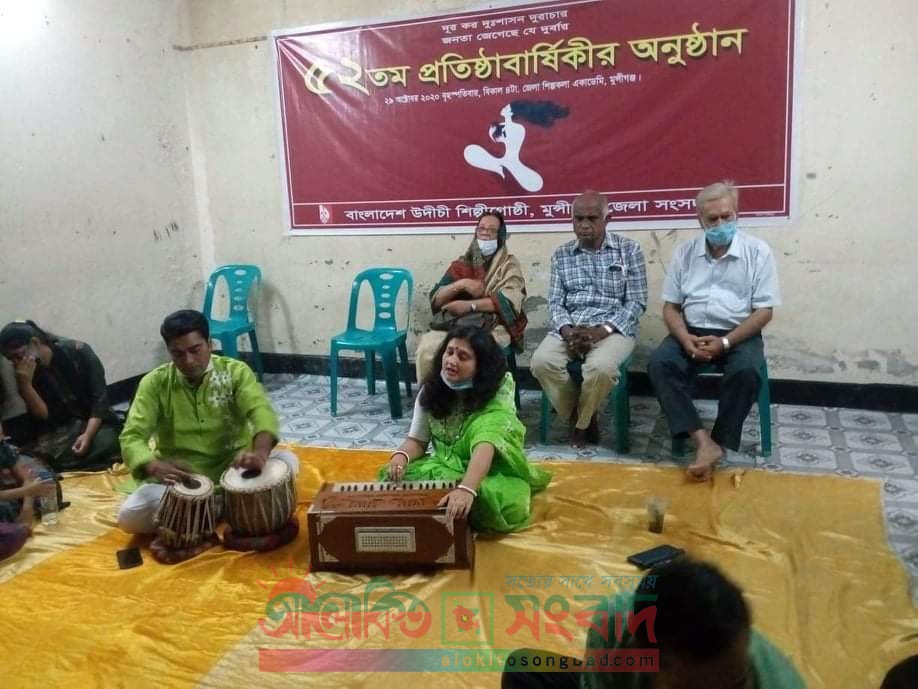 গোবিন্দ চন্দ্র মন্ডল,মুন্সীগঞ্জ প্রতিনিধিঃ নানা আয়োজনে মুন্সিগঞ্জে উদীচীর ৫২ তম প্রতিষ্ঠা বার্ষিকী পালিত হয়েছে। ২৯ অক্টোবর বৃহস্পতিবার বিকেল সাড়ে ৪টায় সারাদেশের ন্যায় একযোগে জাতীয় সংগীত ও সংগঠনের সংগীত পরিবেশনের মাধ্যমে উদীচীর প্রতিষ্ঠা বার্ষিকী উদযাপন করা হয়। বাংলাদেশ উদীচী শিল্পী গোষ্ঠী মুন্সিগঞ্জ জেলা সংসদের সভাপতি খালেদা খানমের সভাপতিত্বে সভায় শুভেচ্ছা বক্তব্য রাখেন পৌরসভার মেয়র হাজী মোহাম্মদ ফয়সাল বিপ্লব। অন্যদের মাঝে আরও বক্তব্য রাখেন বাংলাদেশ মহিলা পরিষদের মুন্সিগঞ্জ শাখার সভাপতি এড. নাছিমা আক্তার, সাংবাদিক আরিফুল ইসলাম, হিরণ কিরণ থিয়েটারের আহ্বায়ক জাহাঙ্গীর আলম ঢালী, সম্মিলিত সাংস্কৃতিক জোটের সাধারণ সম্পাদক সাব্বির হোসেন জাকির, নাট্যকর্মী হুমায়ুন ফরিদ, মুন্সিগঞ্জ থিয়েটারের সভাপতি সোহেল রানা রানু, নাগরিক সমন্বয় পরিষদের সভাপতি সুজন হায়দার জনি, সাংবাদিক সোনিয়া হাবিব লাবনী, কবি পরিষদের সাধারণ সম্পাদক অনু ইসলাম, উদীচীর সহ-সভাপতি আলী নাসিম, উদীচীর সহ-সভাপতি গিয়াসউদ্দিন পিন্টু, ওয়ার্ড কাউন্সিলর নার্গিস আক্তারসহ অন্যান্য সাংস্কৃতিক সংগঠনের নেতৃবৃন্দ। অনুষ্ঠানে সংগীত পরিবেশন করেন বাউল শিল্পী জাহাঙ্গীর হোসেন, সা রে গা মা পা সংগীত বিদ্যালয়ের সভাপতি মোঃ জহিরুল ইসলাম, উদীচীর শিল্পী সুমা দেবনাথ, নাজমা আক্তার ময়না ও মাইসা। তবলায় সঙ্গত করেন উদীচী জেলা সংসদের যুগ্ম সাধারণ সম্পাদক গোবিন্দ চন্দ্র মন্ডল। অনুষ্ঠান পরিচালনায় ছিলেন উদীচী জেলা সংসদের সাধারণ সম্পাদক হামিদা খাতুন।
