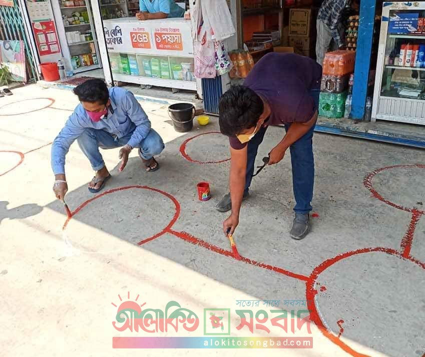 মুন্সীগঞ্জ প্রতিনিধিঃ বিশ্বব্যাপী মহামারী করোনাভাইরাস ছড়িয়ে পরছে। এ ভাইরাস প্রতিরোধে দেশের মানুষের স্বার্থে সারাদেশ লক ডাউন ঘোষণা করেছে সরকার। তবে নিত্য প্রয়োজনে সরকারি-বেসকারি হাসপাতাল, ক্লিনিক, ফার্মিসীর সাথে মুদি দোকান, মাছ-মাংস, শাক-সবজি, ফলসহ বেশকিছু দোকান সীমিত সময়ের জন্য খোলা রাখার অনুমতি দিয়েছেন কর্তৃপক্ষ। করোনাভাইরাসের কারণে তিন ফুট দূরত্ব বজায় রেখে চলাফেরার পরামর্শ দিয়েছেন চিকিৎসকরা। আর এসব কথা চিন্তা করে মুন্সীগঞ্জের লৌহজং উপজেলা ছাত্রলীগ এক ব্যতিক্রম উদ্যোগ নিয়েছে। তারা উপজেলার ১০টি ইউনিয়নের প্রায় প্রতিটি বাজারের এসব দোকানের সামনে তিন ফুট অন্তর অন্তর গোলাকার বৃত্ত চিহ্ন অঙ্কন করেছে। যার ফলে প্রয়োজনে যারা বাজারে আসবেন পন্য ক্রয় করতে, তাদের একজনের সাথে আরেকজনের সংস্পর্শ যেনো না হয়। এমন ব্যতিক্রম উদ্যোগের চিত্র সোশাল মিডিয়ায় মন্তব্যেও ঝড় উঠেছে। তথ্য নিয়ে জানাযায় কিছুদিন যাবৎ উপজেলা ছাত্রলীগ করোনাভাইরাসের ঝুঁঁকি এড়াতে উপজেলার বিভিন্ন ইউনিয়নে মাস্ক বিতরণ করে আসছেন। সে সাথে সর্তক মূলক বক্তব্য দিচ্ছেন ছাত্রলীগের কর্মীরা।লৌহজং উপজেলা ছাত্রলীগের সভাপতি ফরহাদ হোসেন ইমন জানান, আমরা মুজিব সৈনিক। বঙ্গবন্ধু যেমন সোনার বাংলাকে ভালোবেসে দেশের সেবা করেছেন। আমরা তাকে অনুসরণ করে মাননীয় প্রধানমন্ত্রী শেখ হাসিনার নিদের্শনা অনুযায়ী দেশের মঙ্গলে জণসাধারণের সেবা করে যাবো।