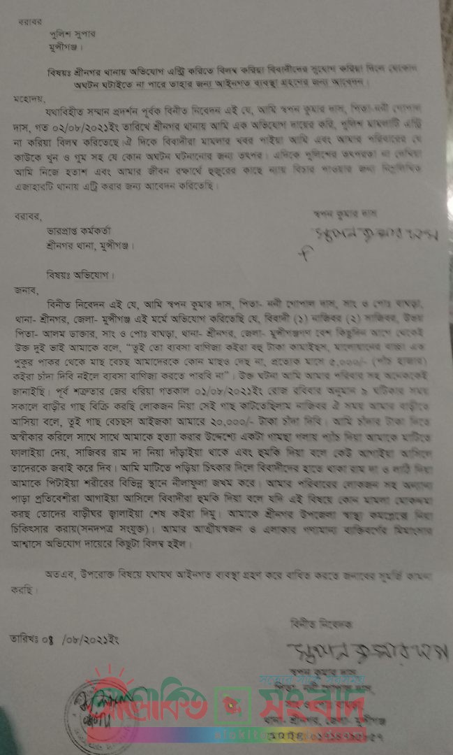 শ্রীনগর (মুন্সীগঞ্জ) প্রতিনিধি:শ্রীনগর উপজেলার বাঘড়া ইউনিয়নের এক সংখ্যালুঘু পরিবারের কাছে চাঁদা দাবির অভিযোগ উঠেছে। এ ঘটনায় বাঘড়া এলাকার আলম ডাক্তারের ছেলে নাজিবর (৩৮) ও সাজিবরের (৩০) বিরুদ্ধে একই এলাকার স্বপন কুমার দাস শ্রীনগর থানায় অভিযোগ দায়ের করেন। অভিযোগকারী স্বপন কুমার দাস বলেন, গত ১লা আগস্ট সকালে বাড়ির সামনে গাছ কাটছিলাম। পুর্ব শত্রুতার জের ধরে নাজিবর ও সাজিবর এসে আমার কাছে ২০ হাজার টাকা চাঁদা দাবি করে। আমি চাঁদার টাকা দিতে অস্বীকার করলে তারা আমাকে মারধর কওে আহত করে। পরিবারের লোকজন আমাকে উদ্ধার করে উপজেলা স্বাস্থ্য কমপ্লেক্স থেকে চিকিৎসা গ্রহন করি। এর কথদিন আগেও তারা আমাকে বলে ব্যবসা বাণিজ্য করে টাকা পয়সা ভালই কামাই করতাছো এখন থেকে আমাদেরকে প্রতি মাসে ৫ হাজার টাকা চাঁদা দিবি। তা না হলে এলাকায় ব্যবসা বাণিজ্য করতে পারবি না। উপায় না পেয়ে শ্রীনগর থানায় অভিযোগ দায়ের করি। স্বপন দাসের পিতা ননী দাস বলেন, অভিযোগ দায়ের পর থেকে অভিযুক্তরা বিভিন্নভাবে হুমকি ঘমকি দিচ্ছে। পরিবার পরিজন নিয়ে এখন আতঙ্কের মধ্যে বসবাস করছি আমরা। মো. নাজিবরের কাছে এবিষয়ে জানতে চাইলে চাঁদা দাবির বিষয়টি অস্বীকার করে বলেন, প্রতিবেশী স্বপন দাসের সাথে আমাদের বাড়ির সীমানা নিয়ে বিরোধ রয়েছে। তবে স্বপন দাসকে মারপিট করার কথা স্বীকার করেন তিনি। স্থানীয় ইউপি সদস্য আনোয়ার হোসেনের কাছে জানতে চাইলে তিনি বলেন, স্বপন দাসকে মারধর করার ঘটনায় সংখ্যালুঘু পরিবারটি আমার কাছে এসেছিল। এ ব্যাপারে অভিযোগটির তদন্তকারী কর্মকতার্ ও শ্রীনগর থানার এসআই আপন কুমার মজুমদার জানান, জমিজমা সংক্রান্ত বিরোধের জের ধরে মারপিটের ঘটনা ঘটেছে। এঘটনায় দ্রুত ব্যবস্থা নেওয়া হবে।