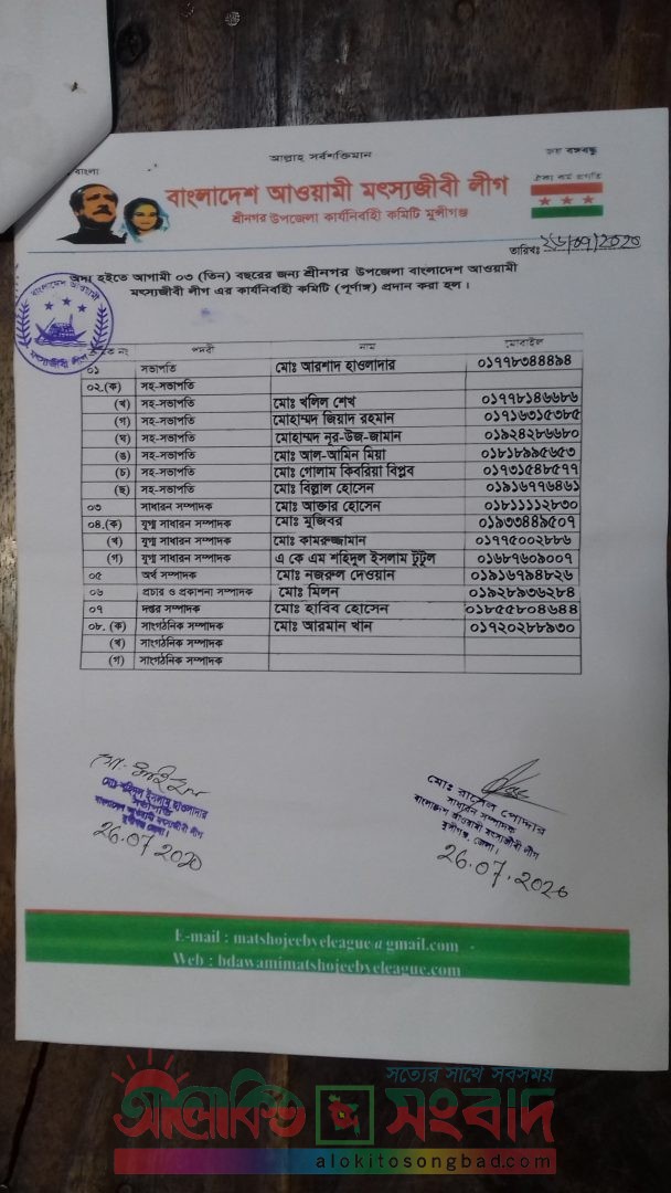শ্রীনগর(মুন্সিগঞ্জ)প্রতিনিধিঃ মুন্সিগঞ্জ জেলার শ্রীনগর উপজেলা শাখার আওয়ামী মৎসজীবী লীগের কমিটি গঠন করা হয়েছে । মোঃ আরশাদ হাওলাদারকে সভাপতি ও মোঃ আক্তার হোসেনকে সাধারন সম্পাদক করে এ কমিটি গঠন করা হয়। ২৬ জুলাই রবিবার মুন্সীগঞ্জ জেলা আওয়ামী মৎসজীবী লীগের সভাপতি মোঃ শহিদুল ইসলাম হাওলাদার ও সাধারন সম্পাদক মোঃ রাসেল পোদ্দার যৌথ স্বাক্ষরিত দলীয় প্যাডে এ কার্যনির্বাহী কমিটির অনুমোদন দেন। কমিটির অন্য সদস্যরা হলেন সহ-সভাপতি ১.মোঃ খলিল শেখ ২. মোহাম্মদ জিয়াদ রহমান ৩. মোহাম্মদ নুরুজ্জামান ৪.মোঃ আল আমিন মিয়া ৫.মোঃ গোলাম কিবরিয়া ৬. মোঃ বিল্লাল হোসেন, যুগ্ম সাধারন সম্পাদক ১. মোঃ মজিবর রহমান ২. মোঃ কামরুজ্জামান ৩. এ কে এম শহিদুল ইসলাম টুটুল, সাংগঠনিক সম্পাদক মোঃ আরমান, প্রচার ও প্রকাশনা সম্পাদক মোঃ মিলন, দপ্তর সম্পাদক মোঃ হাবিব হোসেন। মোট ৪৭ সদস্য বিশিষ্ট কার্যনির্বাহি এ কমিটি আগামী তিন বছর শ্রীনগর উপজেলা শাখার দায়িত্ব পালন করবেন।
