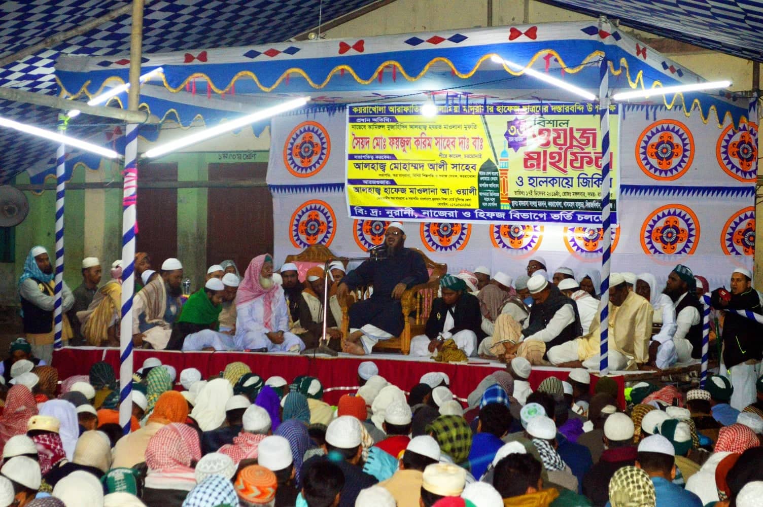 মুন্সীগঞ্জের সিরাজদিখান উপজেলার বালুচর ইউনিয়নের কয়রাখোলা গ্রামের কয়রাখোলা আরাফাতিয়া ইসলামিয়া মাদরাসার হাফেজ ছাত্রদের পাগড়ী প্রদান উপলক্ষ্যে ৩৬ তম ওয়াজ মাহফিল অনুষ্ঠিত হয়েছে। কয়রাখোলা আরাফাতিয়া ইসলামিয়া মাদরাসার মুহতামিম ও বাংলাদেশ কোরআন শিক্ষা বোর্ড মুন্সীগঞ্জ জেলা শাখার সভাপতি আলহাজ্ব হাফেজ মাওলানা আ: ওয়ালী’র আয়োজনে গত মঙ্গলবার সন্ধ্যা থেকে মধ্যরাত পর্যন্ত মাদরাসা সংলগ্ন মাঠে এ ওয়াজ মাহফিল অনুষ্ঠিত হয়। কয়রাখোলা আরাফাতিয়া ইসলামিয়া মাদরাসার সভাপতি আলহাজ্ব মোহাম্মদ আলীর সভাপতিত্বে প্রধান অতিথী ও প্রধান বক্তা হিসেবে উপস্থিত ছিলেন, নায়েবে আমীরুল মুজাহিদীন শাইখুল হাদীস আল্লামা মুফ্তী সৈয়দ মুহাম্মদ ফয়জুল করীম (পীর সাহেব চরমোনাই)। বিশেষ অতিথী হিসেবে উপস্থিত ছিলেন, সিরাজদিখান উপজেলা আওয়ামী লীগ সাধারণ সম্পাদক ও বালুচর ইউনিয়ন পরিষদের চেয়ারম্যান আবু বকর সিদ্দিক, কয়রাখোলা আরাফাতিয়া ইসলামিয়া মাদরাসার সাধারণ সম্পাদক আলহাজ্ব মো: মনির হোসেন, উপজেলা শ্রমিক লীগের শ্রম কল্যান বিষয়ক সম্পাদক ও বিশিষ্ট সমাজ সেবক আব্দুল মান্নান মাষ্টার। মাহফিলে অন্যান্য বক্তাদের মধ্যে উপস্থিত ছিলেন, উত্তরা এয়ারপোর্ট জামে মসজিদের খতিব হযরত মাওলানা বিন ইয়ামিন সা’দী, সাহেবজাদা পীর সাহেব মধুপুর ও মোহতামিম আলহাজ্ব হযরত মাওলানা হাফেজ আহমাদুল্লাহ, আলীরটেক মাদরাসা ও ভাষানচর মাদরাসার প্রতিষ্ঠাতা আলহাজ্ব হযরত মাওলানা হাফেজ আতাউল হক সরকার, নায়েবে মুহতামিম ও রামকৃষ্ণদী আবু বক্কর জামিয়ার প্রধান মুফতি হযরত মাওলানা মুফতি মাহমুদ জহির কাসেমী, নয়াগাও মাদবরের হাট এমদাদুল উলূম মহিলা মাদরাসার মোহতামিম আলহাজ্ব হযরত মাওলানা আব্দুল জব্বার, হাফেজ মোহাম্মদ কবির হোসেন। এছাড়া স্থানীয় ধর্মপ্রান মুসল্লিসহ গণ্যমান্য ব্যক্তিবর্গ উপস্থিত থেকে ওয়াজ মাহফিল শ্রবন করেন ও হালকায়ে জিকিরে অংশ গ্রহন করেন।