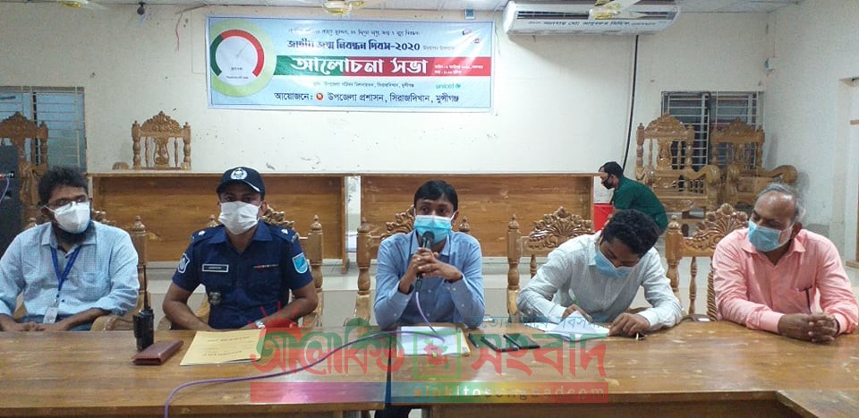 সিরাজদিখান (মুন্সীগঞ্জ) প্রতিনিধি: ”নাগরিক অধিকার করতে সুরক্ষণ, ৪৫ দিনের মধ্যে জন্ম ও মৃত্যু নিবন্ধন” এই প্রতিপাদ্যকে সামনে রেখে সিরাজদিখানে জাতীয় জন্ম নিবন্ধন ২০২০ উদযাপন উপলক্ষে আলোচনা সভা অনুষ্ঠিত হয়েছে। গতকাল মঙ্গলবার বেলা ১১ টায় উপজেলা পরিষদ মিলনায়তনে ও উপজেলা প্রশাসনের আয়োজনে এ আলোচনা সভা অনুষ্ঠিত হয়। উপজেলা নির্বাহী কর্মকর্তা সৈয়দ ফয়েজুল ইসলামের সভাপতিত্বে উপস্থিত ছিলেন সিরাজদিখান থানার পুলিশ পরিদর্শক (তদন্ত) মোহাম্মদ এমদাদুল হক, লতব্দী ইউপি চেয়ারম্যান এসএম সোরহাব হোসেন, উপজেলা প্রকৌশলী শোয়াইব বিন আজাদ, উপজেলা প্রকল্প বাস্তবায়ন কর্মকর্তা আইমিন সুলতানা, উপজেলা স্বাস্থ্য কমপ্লেক্সের আর এম ও ডা. এ কেএম তাইফুল হক, উপজেলা পরিবার পরিকল্পনা কর্মকর্তা মো. আরাফাত হোসেন, স্বাস্থ্য পরিদর্শক ইন্সপেক্টর দ্বীনেশ চন্দ্র মন্ডল সহ আরো অনেকে
