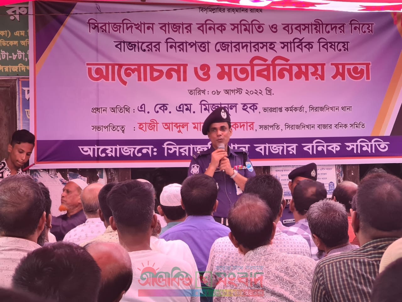 মুন্সীগঞ্জের সিরাজদিখান বাজার বনিক সমিতি ও ব্যবসায়ীদের নিয়ে বাজারে সকল স্থানে সিসিটিভি স্থাপন, নিরাপত্তা জোরদারসহ সার্বিক বিষয়ে থানা পুলিশের আলোচনা ও মতবিনিময় সভা অনুষ্ঠিত হয়েছ। গতকাল সোমবার  ৫ টায় উপজেলার রশুনিয়া ইউনিয়নের সিরাজদিখান বাজার বনিক সমিতির আয়োজনে বাজার মসজিদ সংলগ্ন বাজার বনিক সমিতির সভাপতি হাজী আব্দুল মান্নান সিকদারের সভাপতিত্বে এই আলোচনা ও মতবিনিময় সভা অনুষ্ঠিত হয়।