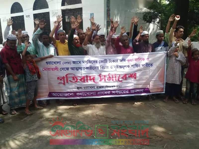 মুন্সীগঞ্জের সিরাজদিখান উপজেলার গুয়াখোলা (নগর) জামে মসজিদের ভূয়া মোতায়াল্লী ও জমির মালিক সেজে মসজিদের জমি আত্নসাতকারীদের বিরুদ্ধে প্রতিবাদ সভা ও র্যালী করেছে স্থানীয় মুসল্লীরা। গতকাল শুক্রবার (২৮ আগষ্ট) বাদ জুম’আ উপজেলার গুয়াখোলা (নগর) জামে মসজিদের সামনে থেকে র্যালী বের করা হয়। পরে মসজিদ কমিটির সভাপতি সামসুজ্জামান পনিরের সভাপতিত্বে মসজিদের জমি আত্নসাতকারীদের বিরুদ্ধে প্রতিবাদ সভা করা হয়। এসময়, মুসল্লী আব্দুল মান্নান, হাজী সোবাহান খান, আইয়ুব খান মেম্বার, জয়নাল দেওয়ান, মোঃ হাবীব, জাকির হোসেন চঞ্চল, মোঃ শাহাবুদ্দিন, মোঃ নাসিরউদ্দিন (নাসু) মাদবরসহ স্থানীয় এলাকাবাসী সভায় অংশগ্রহণ করেন। সভায় অনতিবিলম্বে মসজিদের জমি ফিরিয়ে দেয়াসহ দোষীদের বিরুদ্ধে শাস্তিমূলক ব্যবস্থা গ্রহনের জন্য প্রশাসনে দৃষ্টি আকর্ষণ করে জোর দাবী জানানো হয়।