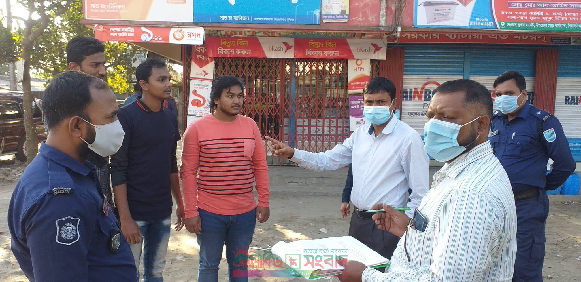 সিরাজদিখান (মুন্সীগঞ্জ) প্রতিনিধি: মুন্সীগঞ্জের সিরাজদিখানে “নো-মাস্ক নো-সার্ভিস” সরকারী নির্দেশনা বাস্তবায়নে মাস্ক না পড়ায় উপজেলা প্রশাসনের ভ্রাম্যমাণ আদালত পরিচালনা করা হয়েছে। গতকাল সোমবার বিকার ৩ টা থেকে ৪ টা পর্যন্ত উপজেলার মোড়ে মাস্ক না পড়ায় ভ্রাম্যমাণ আদালতের মাধ্যমে ৫ জনকে জরিমানা করা হয়। ভ্রাম্যমাণ আদালত পরিচালনা করেন এক্সিকিউটিভ ম্যাজিষ্ট্যট ও উপজেলা নির্বাহী কর্মকর্তা সৈয়দ ফয়েজুল ইসলাম। এসময় তিনি পথচারি, যানবাহনের চালক ও যাত্রীদের কে মাস্ক ব্যবহারের গুরুত্ব তুলে ধরেন। মাস্ক ছাড়া ব্যক্তিদের মাস্ক পরিধান করিয়ে দেন এবং মাস্ক না পড়ায় দন্ডবিধি ১৮৬০ এর ২৬৯ ধারায় মোট ৫ জনকে ১৭০০ টাকা জরিমানা করা হয়। এসময় উপজেলা নির্বাহী কর্মকর্তা সৈয়দ ফয়েজুল ইসলাম বলেন, সরকারের নির্দেশ বাস্তবায়ন ও জনসচেতনতা সৃষ্টির লক্ষ্যে আমরা জনসাধারণকে মাস্ক ছাড়া যাতে হাট-বাজার রাস্তা ঘাট ও যানবাহনে না উঠে সে লক্ষ্যে জনসচেতনতা মূলক কাজ করে যাচ্ছি। আর যানবাহনের চালকদেরকে বলে দিয়েছি মাস্ক ছাড়া গাড়িতে না উঠাতে। ঘর থেকে বের হলেই বাধ্যতামূলক মাস্ক পড়তে হবে জনসাধারণকে । তানা হলে কঠোর হাতে ব্যবস্থা গ্রহণ করা হবে।