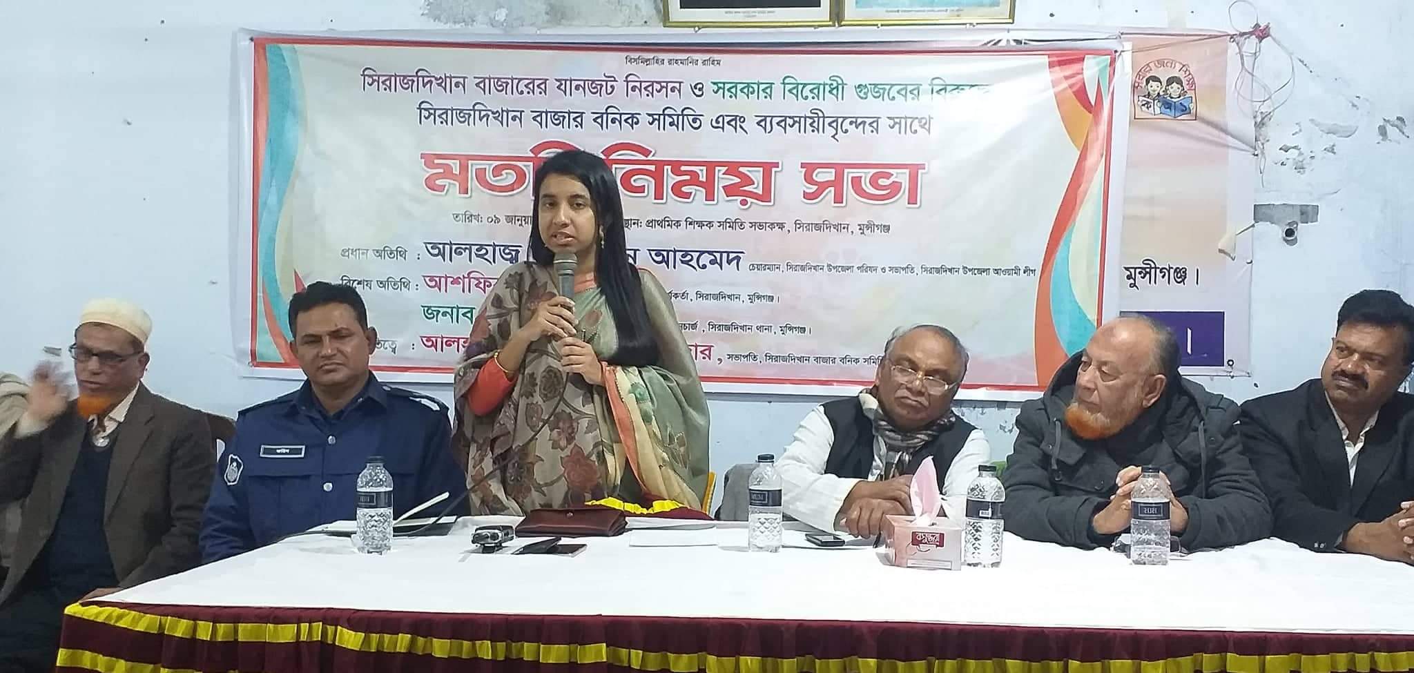 সিরাজদিখান (মুন্সীগঞ্জ) প্রতিনিধিঃ মুন্সীগঞ্জের সিরাজদিখান বাজারের যানজট নিরসসহ সরকার বিরোধী গুজব রোধ ও এ সংক্রান্তে সচেতনতা বৃদ্ধির লক্ষ্যে সিরাজদিখান বাজার বনিক সমিতি এবং ব্যবসায়ীদের সাথে মত বিনিময় সভা অনুষ্ঠিত হয়েছে। সিরাজদিখান থানার অফিসার ইনচার্জ এর উদ্যোগে ও সিরাজদিখান বাজার বনিক সমিতির আয়োজনে গতকাল বৃহস্পতিবার বেলা সাড়ে ১১ টায় উপজেলা প্রাথমিক শিক্ষক সমিতির সভাকক্ষে এ মত বিনিময় সভা অনুষ্ঠিত হয়। বাজার বনিক সমিতির সভাপতি আব্দুল মান্নান শিকদারের সভাপতিত্বে অনুষ্ঠানে প্রধান অতিথী হিসেবে উপস্থিত ছিলেন উপজেলা আওয়ামীলীগ সভাপতি ও উপজেলা চেয়ারম্যান হাজী মহিউদ্দিন আহমেদ। বিশেষ অতিথী হিসেবে উপস্থিত ছিলেন, উপজেলা নির্বাহী কর্মকর্তা আশফিকুন নাহার, থানার অফিসার ইনচার্জ (ওসি) মো. ফরিদ উদ্দিন। অন্যান্য অতিথীদের মধ্যে উপস্থিত ছিলেন সাবেক লতব্দী ইউনিয়ন পরিষদ চেয়রাম্যান হাফেজ মোঃ ফজলুল হক, বাজার বনিক সমিতির সাধারণ সম্পাদক মো. মোতাহার হোসেন। সভায় বক্তারা যানজন নিরসনের লক্ষ্যে বিভিন্ন গুরুত্বপূর্ণ দিক তুলে ধরেন।