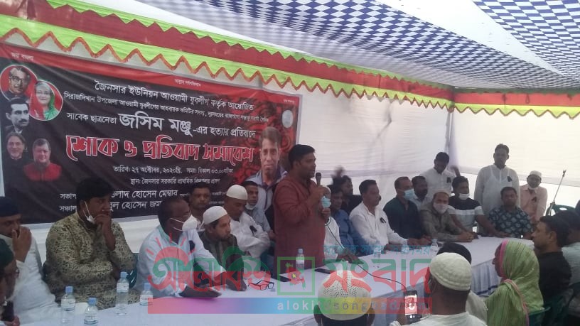 সিরাজদিখান (মুন্সীগঞ্জ) প্রতিনিধি: মুন্সীগঞ্জের সিরাজদিখানে উপজেলা যুবলীগ আহবায়ক কমিটির সদস্য ও সাবেক জৈনসার ইউনিয়ন ছাএলীগ সভাপতি জসিম মঞ্জুর হত্যার প্রতিবাদে শোক ও প্রতিবাদ সমাবেশ করেছে জৈনসার ইউনিয়ন যুবলীগ। গতকাল মঙ্গলবার বিকেল ৪ টায় উপজেলার জৈনসার ইউনিয়নের জৈনসার সরকারি প্রাথমিক বিদ্যালয়ে ইউনিয়ন আওয়ামী যুবলীগের সভাপতি আওলাদ হোসেন মেম্বার এর সভাপতিত্বে ও সাধারণ সম্পাদক আবুল হোসেন জমাদ্দার এর সঞ্চাচলায় বক্তব্য রাখেন উপজেলা ভাইস চেয়ারম্যান উপজেলা যুবলীগের আহবায়ক মঈনুল হাসান নাহিদ, উপজেলা যুবলীগের যুগ্ম আহ্বায়ক মাসুদ লস্কর। আরো বক্তব্য রাখেন জৈনসার ইউপি চেয়ারম্যান রফিকুল ইসলাম দুদু, উপজেলার আওয়ামী লীগের সাবেক সহ প্রচার সম্পাদক এড. ইসলাম শেখ, ইউনিয়ন আওয়মী লীগ সভাপতি লুৎফর রহমান, সাধারণ সম্পাদক কাঞ্চনা আলী গোলাপী, উপজেলা কৃষক লীগের সাধারণ সম্পাদক গোলাম মোস্তফা সেন্টু। উপজেলা যুবলীগের আহবায়ক কমিটির সদস্য রাকিবুল ইসলাম রাকিব, সাবেক যুগ্ম আহবায়ক তৌহিদ খান সম্রাট, সদস্য ইঞ্জিনিয়ার আসাদুজ্জামান বিপ্লব, আরাফাত শেখ রাসেল। রশুনিয়া ইউনিয়ন যুবলীগ সভাপতি জি এম শাহ আলম, ইছাপুরা ইউনিয়ন যুবলীগ সভাপতি সুখন চৌধুরী, যুবলীগ নেতা ফরহাদ হোসেন, রুহুল আমীন বেপারী, আল ইসলাম হাওলাদার, বিকাশ ব্যার্নাজি, মিজানুর রহমান মোল্লা, মো. জাহিদুল হক জাহিদ। এ সময়ে বক্তারা এ হত্যাকান্ডের সুষ্ঠ তদন্ত দাবি করেন এবং বিচার চান। নিহতের বড় ভাই হাজী রাজ্জাক বলেন আমার ভাইকে বাড়িথেকে ডেকে নিয়ে হত্যা করা হয়েছে